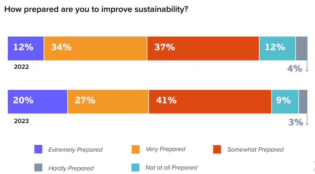 Preparing for upcoming regulations and laws is an important topic for manufacturers in 2023. 20% of the respondents we polled noted that they are extremely prepared to improve, that’s up 8% from 2022. Even the manufacturers who were hardly prepared decreased 3% from last year. This increase in preparation isn’t only because of regulations, but also because of customer demands.